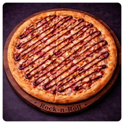 Состав: Соус томатный, орегано, салями, ветчина, бекон, курица копченая, корнишоны, сыр моцарелла, соус барбекю