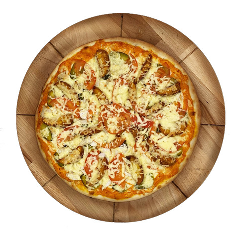 Состав: Солёный огурец, курица копченая, сыр моцарелла, соус фирменный, картофель по-деревенски, томат, сыр твёрдый
