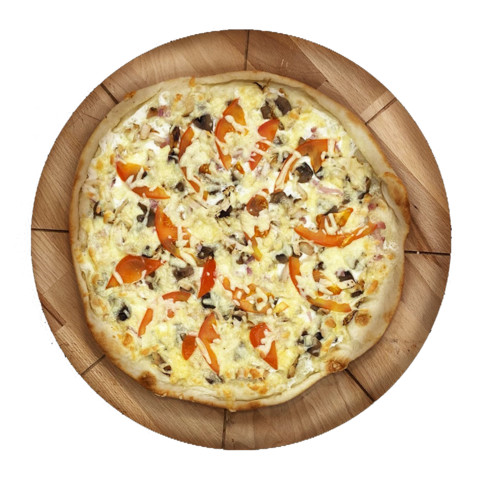 Состав: Бекон, томат, шампиньоны, курица, сыр моцарелла, сыр российский, соус фирменный