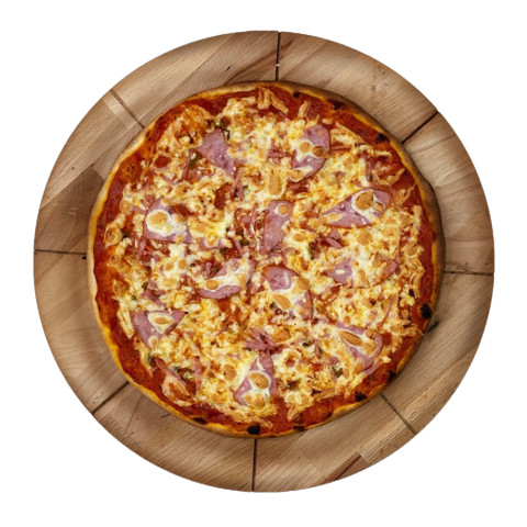 Состав: Ветчина, сыр моцарелла, сыр российский, майонез, фирменный соус, халапеньо (острый перец), масло чесночное
