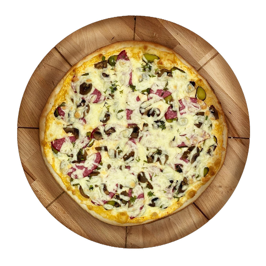 Состав: Соус фирменный, огурец солёный, солями, грибы, сыр моцарелла