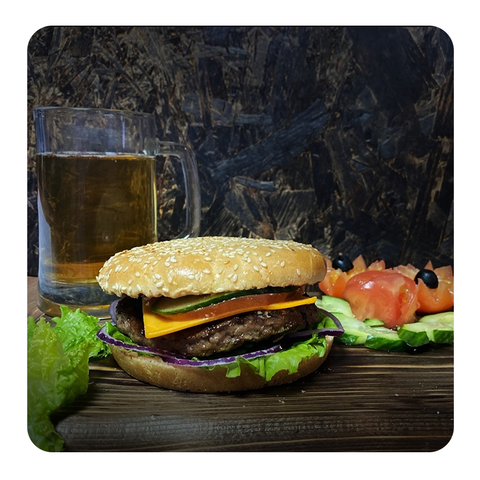 Состав: Булочка с кунжутом большая, Котлета говяжья большая, сыр, салат, помидор, лук красный, соус бургер