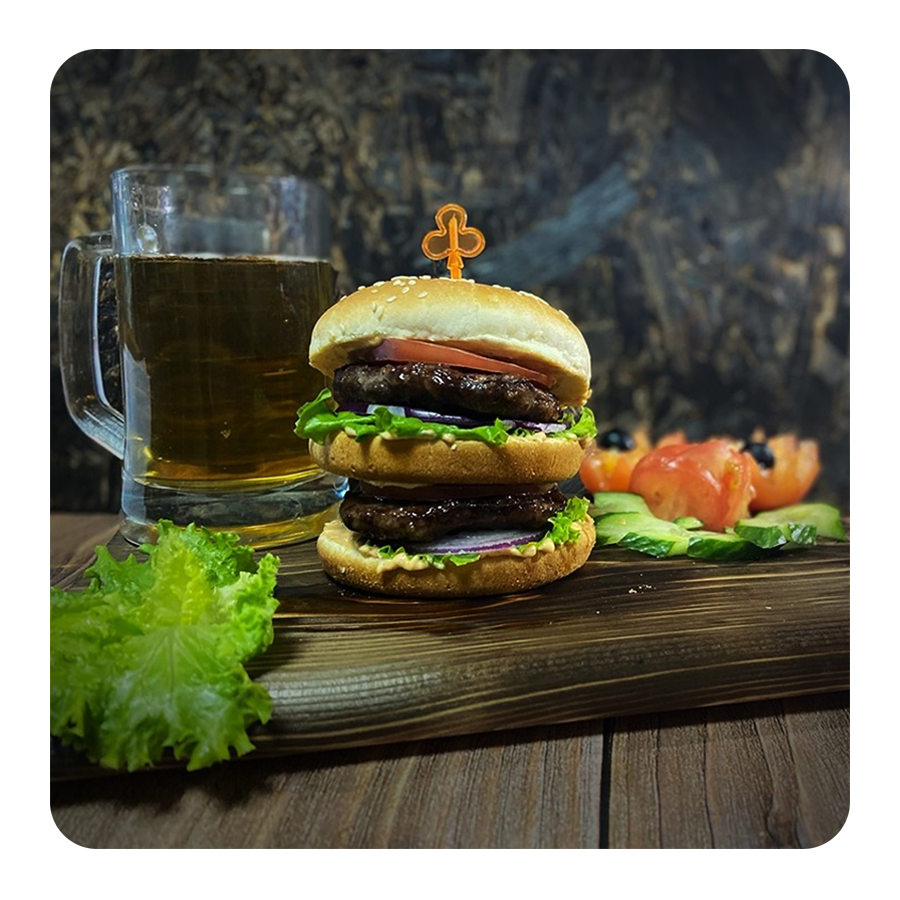 Состав: Булочка с кунжутом , Котлета говяжья 2 штуки, сыр, салат, помидор, лук красный, соус бургер