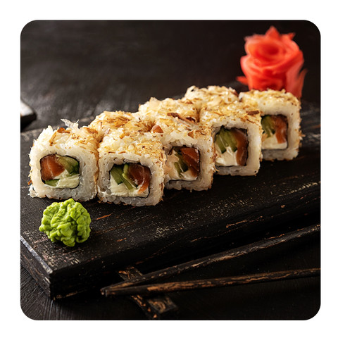 Состав: Рис, нори, сыр, огурец, лосось, стружка тунца