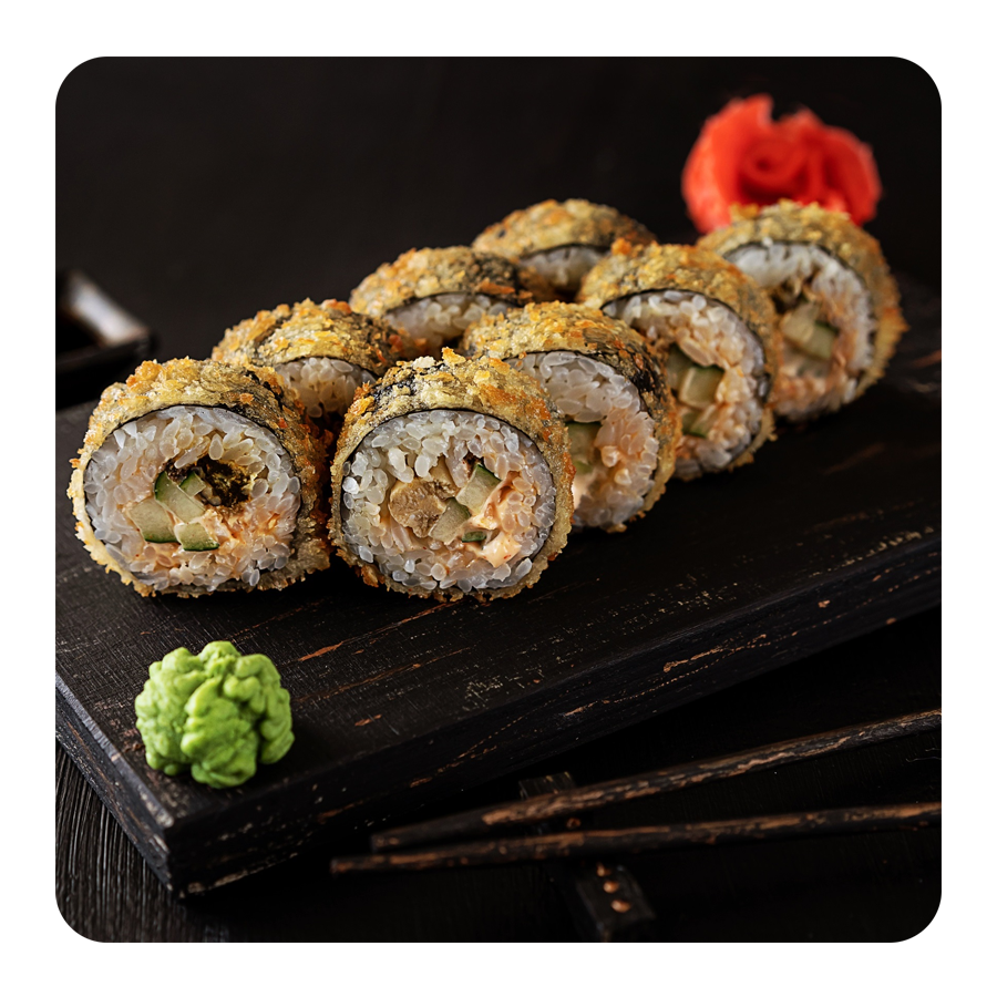 Состав: Рис, соус спайси, нори, мидии, огурец, панировочные сухари