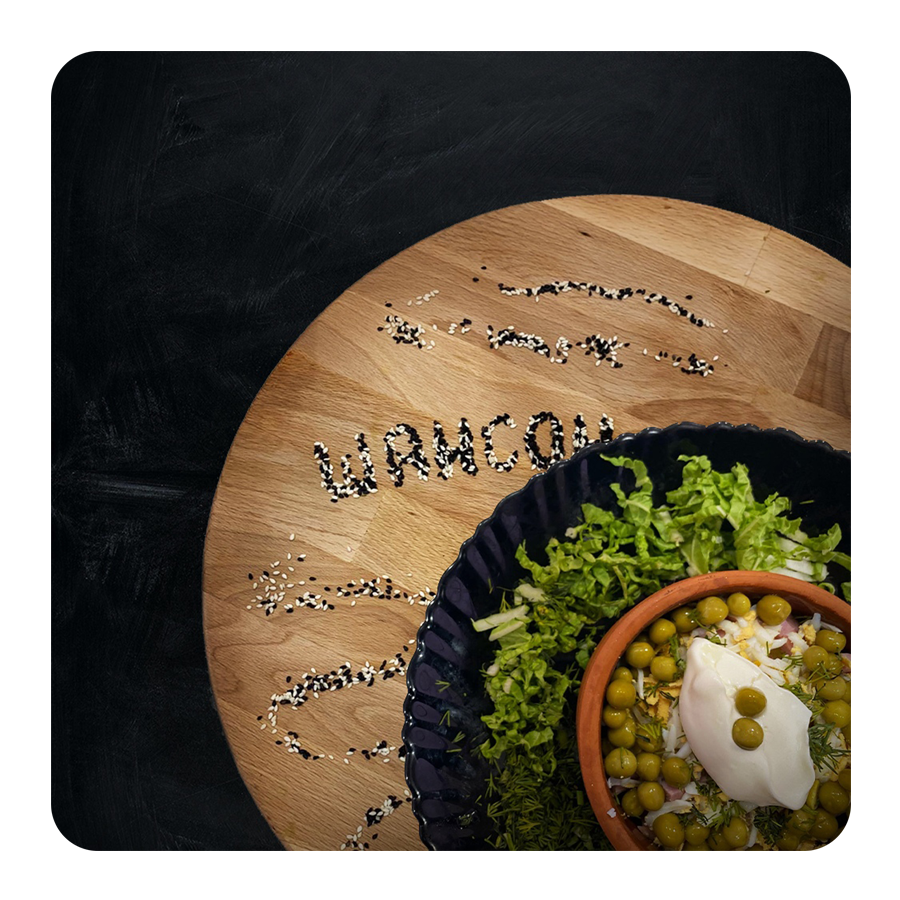 Состав: Картофель, огурец, морковь, колбаса, яйцо, зеленый горошек, майонез, зелень