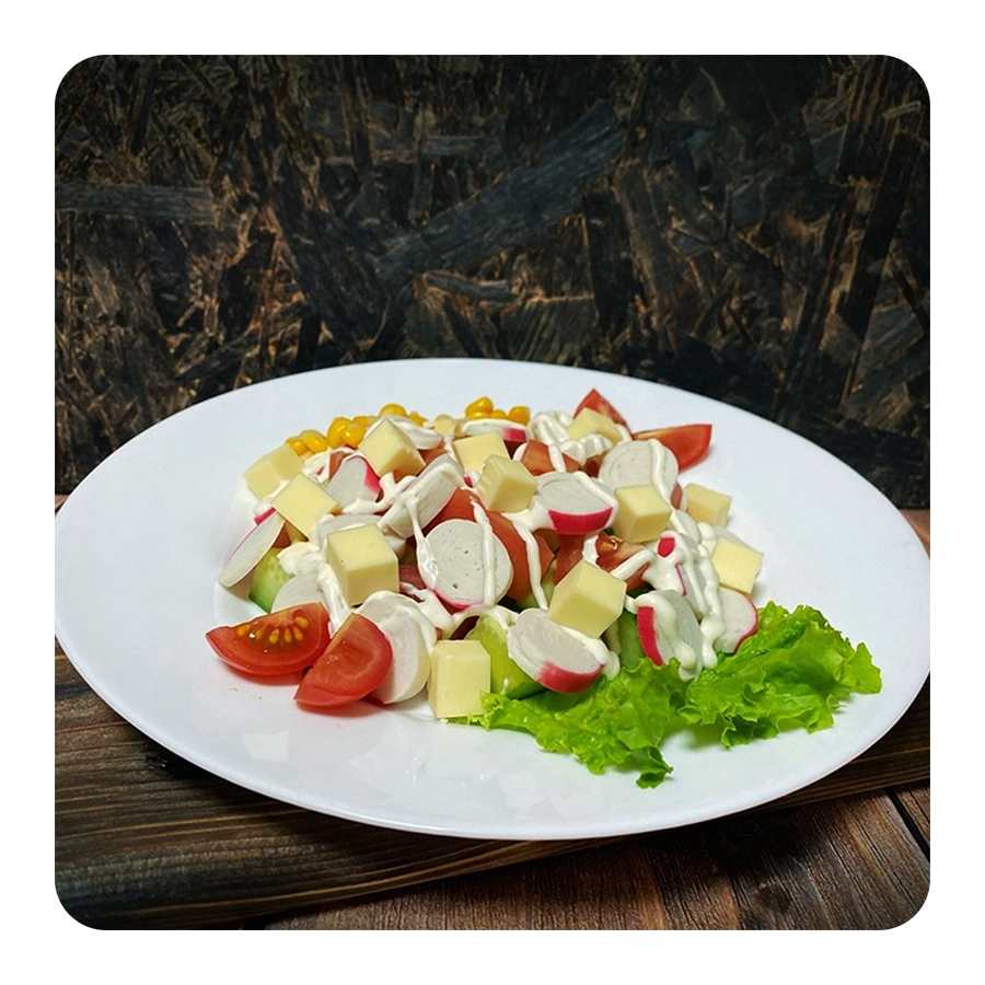 Состав: Огурец, помидор, сыр, снежный краб, майонез, помидоры черри, салат, кукуруза