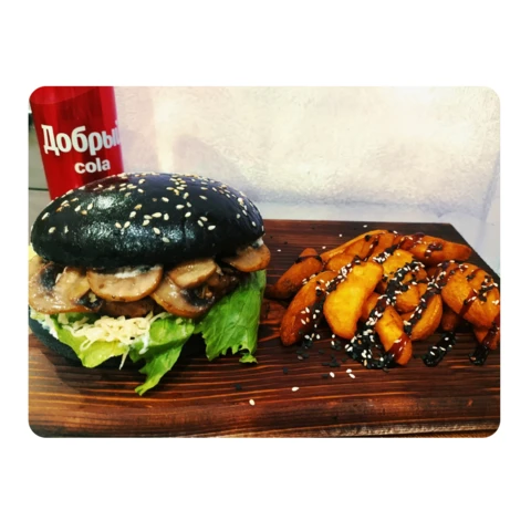 Состав бургер: Черная булочка с кунжутом большая, котлета говяжья большая, салат айсберг, лук красный, помидор, грибы шампиньоны (опята) жаренные, сыр Гауда, соус Трюфельный, соус Грибной. Картофель по-деревенски с соусом унаги, кунжут для украшения